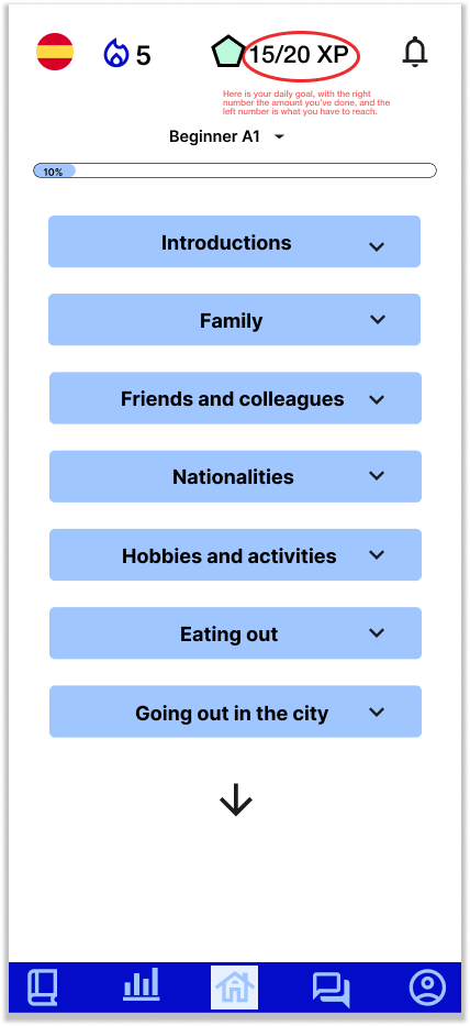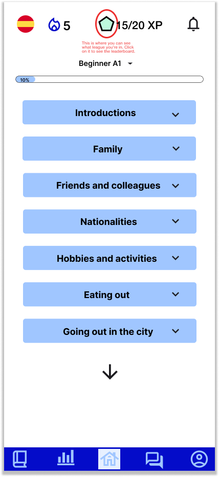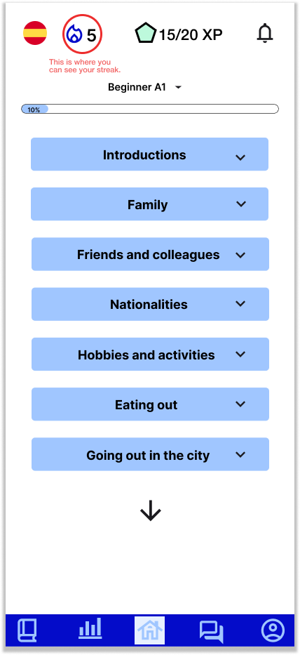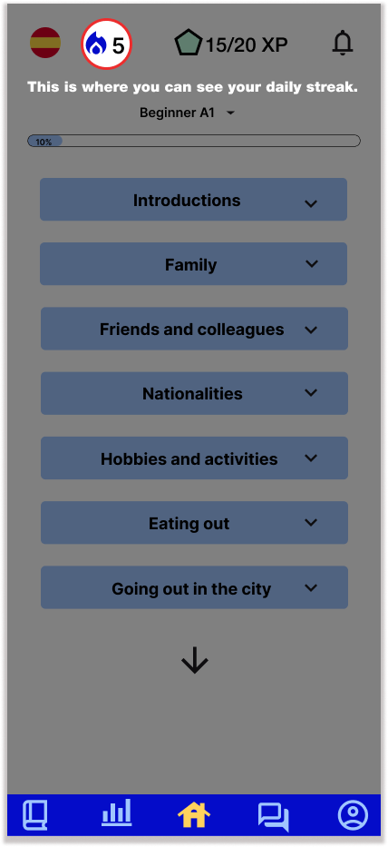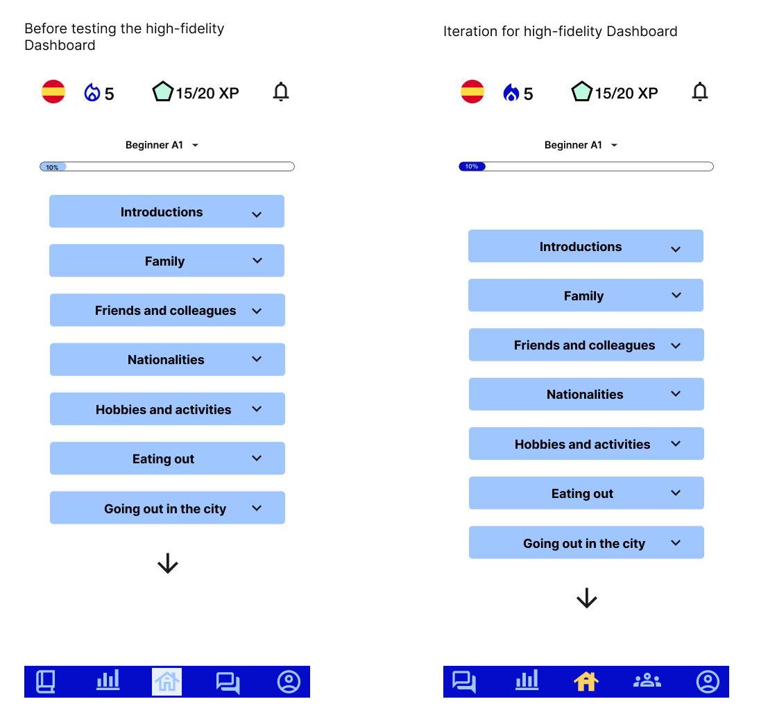 For the dashboard, I fixed the spacing issue as well as changing the streak icon to reflect a lesson has been completed, on top of changing the way the “home” icon is presented underneath.
