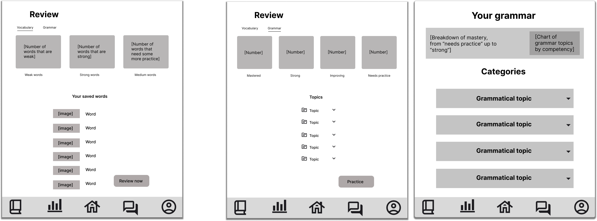 This was my first attempt at creating the Review section, which is where users could see all the material they’ve completed up to their current lesson and go over them again. The image on the left is what I envisioned for the vocabulary component, since the idea of this project would be to offer a service for users to have specific words under their belt. With the two images on the right, I had to conduct A/B testing in my interviews to see which version of the grammar component would work best here: they ultimately chose the rightmost one, as they felt it was aesthetically and functionally better.