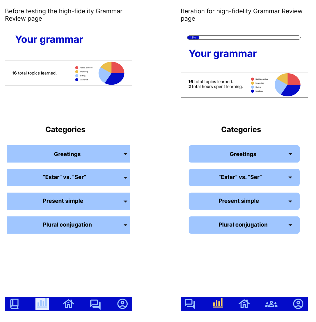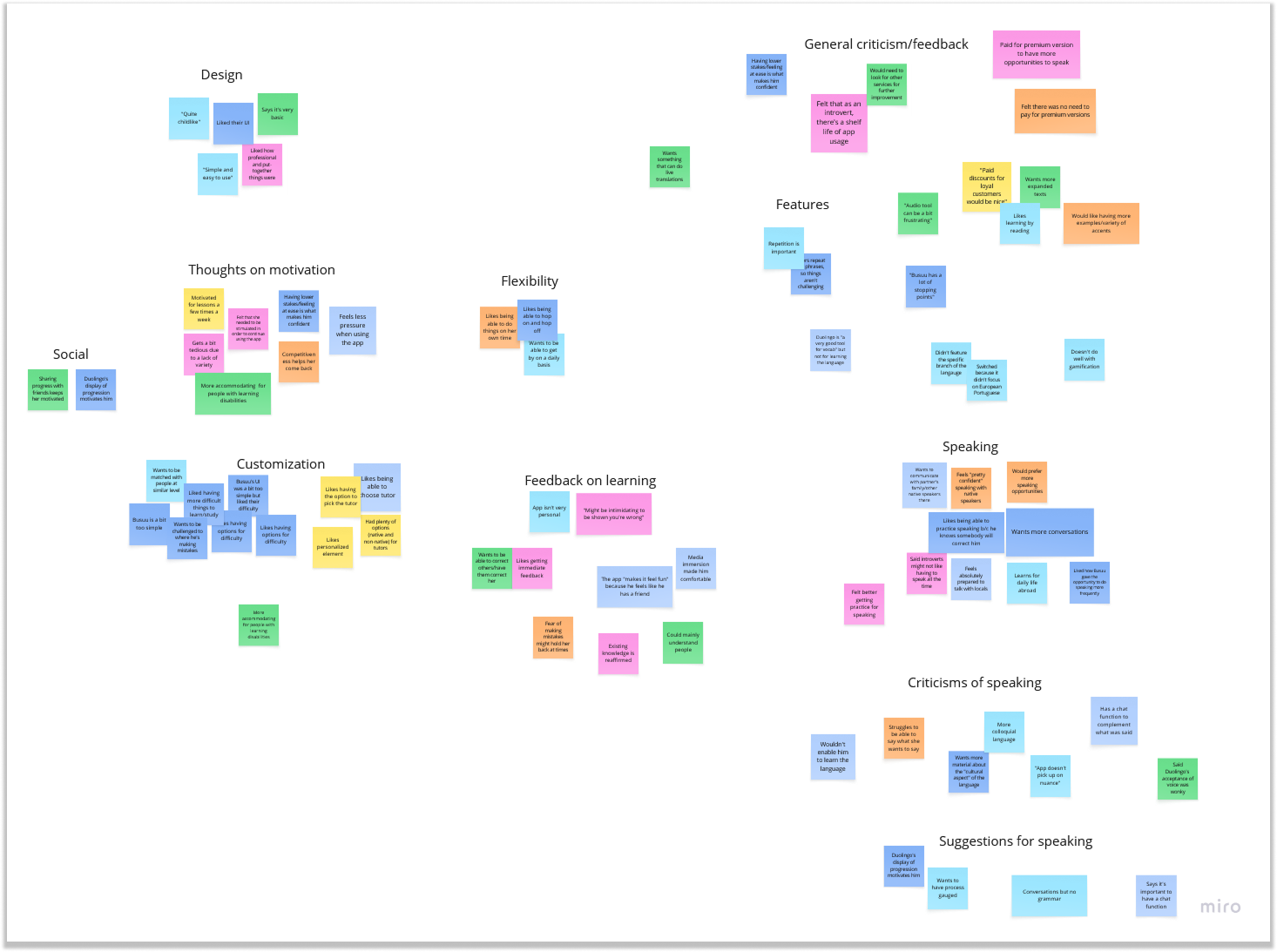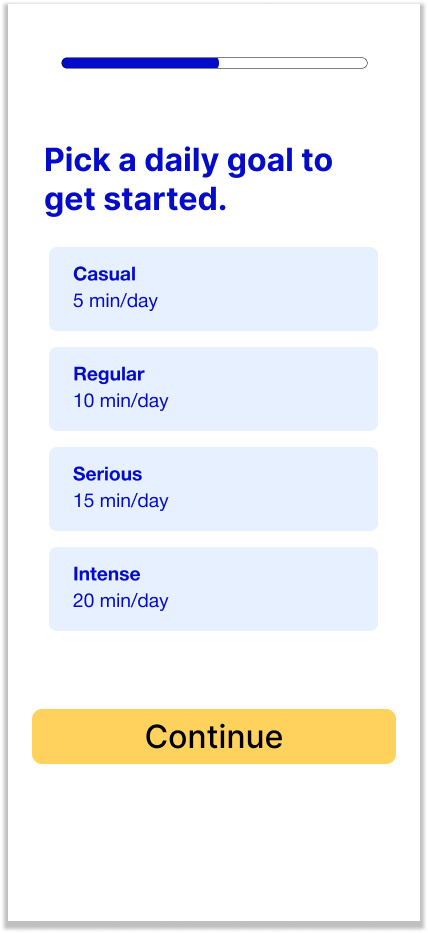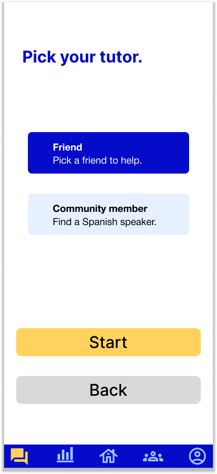 Summary of testing: Six people were interviewed regarding the high-fidelity wireframes. None of them had previously participated. All but one had prior experience with language learning apps.