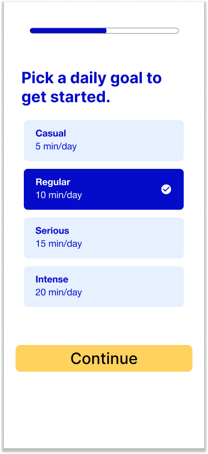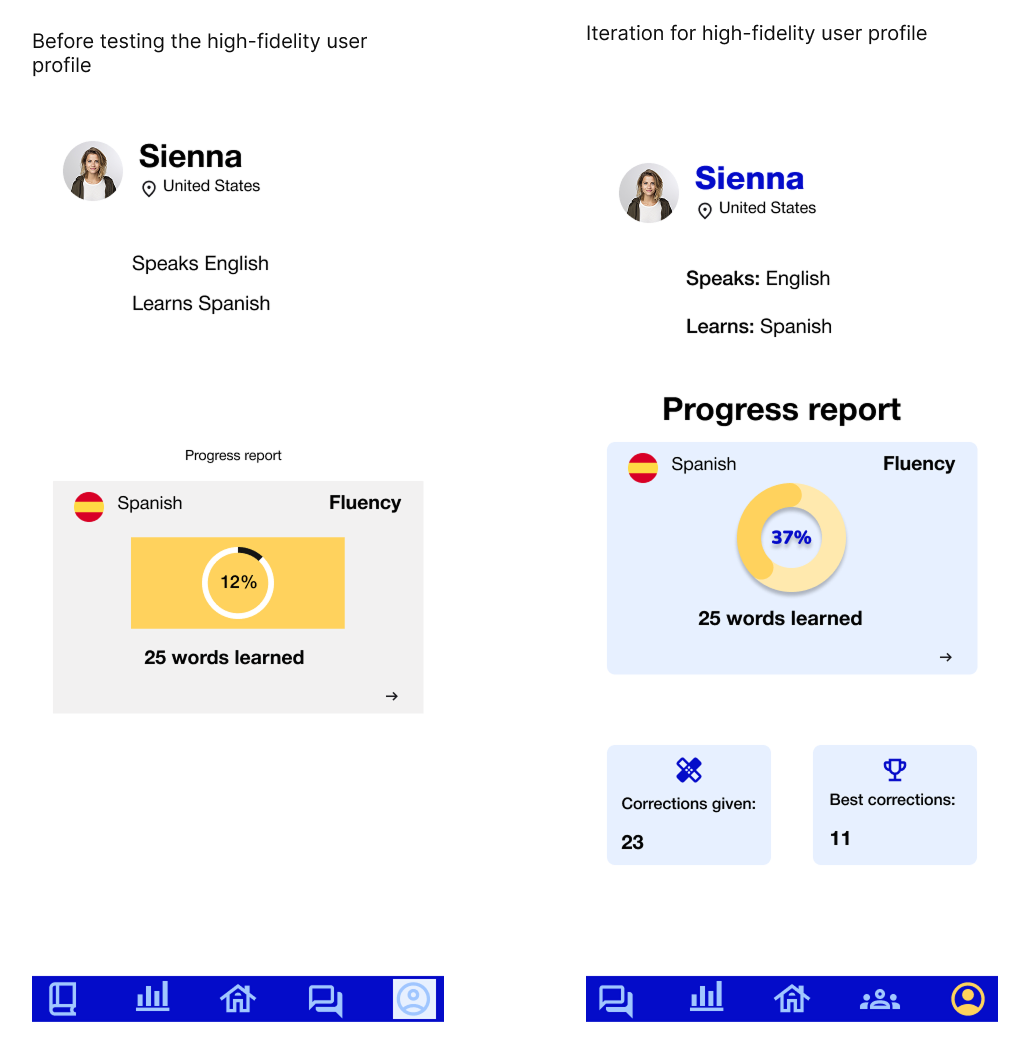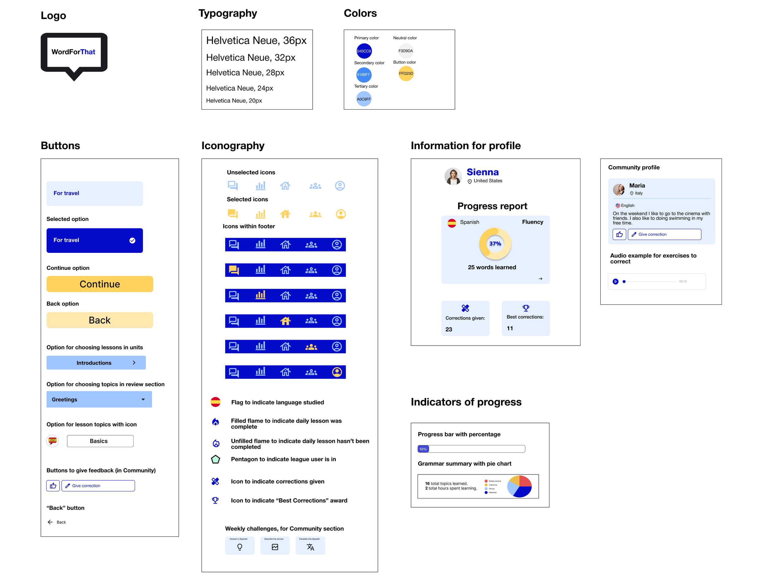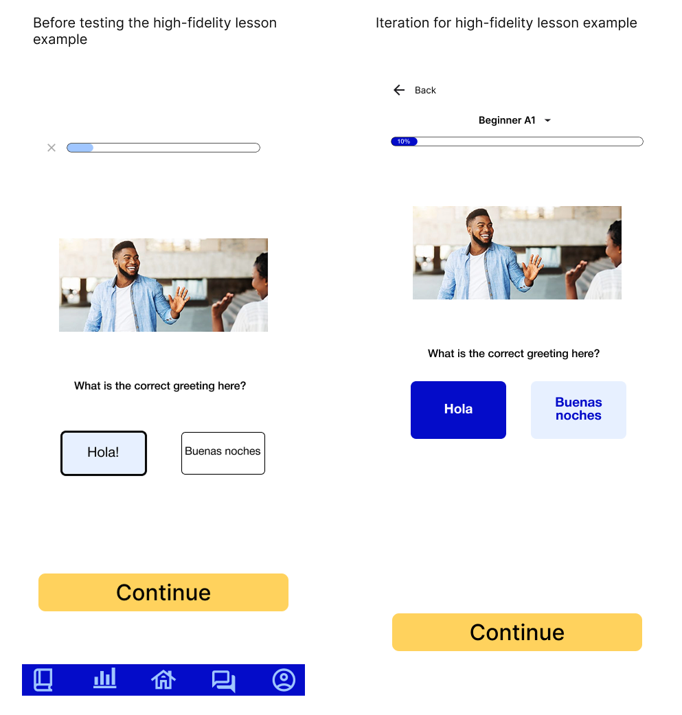 Summary of testing: Six people were interviewed regarding the high-fidelity wireframes. None of them had previously participated. All but one had prior experience with language learning apps.