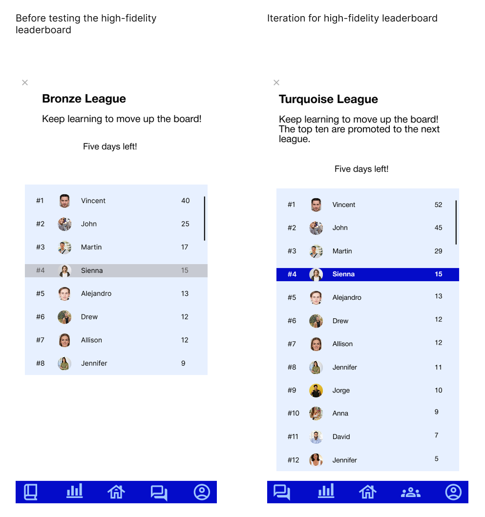 Ensuring the leaderboard felt comprehensive was what I wanted to test, and feedback received told me that I simply needed to elongate it for easier scrolling. The second piece of feedback was that it should be clearer where a user was on it.