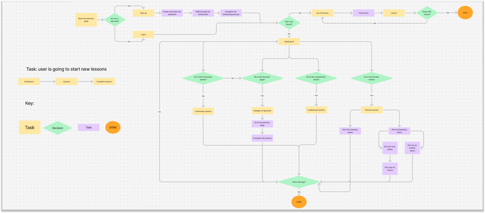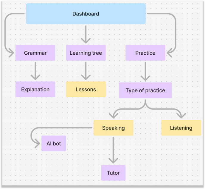 After Sienna, the app’s flows were established, with the intent to be straightforward; the first round of interviews had mentioned that this was something vital for every language learner. I envisioned a hub where users would be able to branch out to the features they needed at that particular time. The sitemap here shows the simplicity of it, with the user flow underneath it--I spent time ensuring both processes wouldn’t be overwhelming.