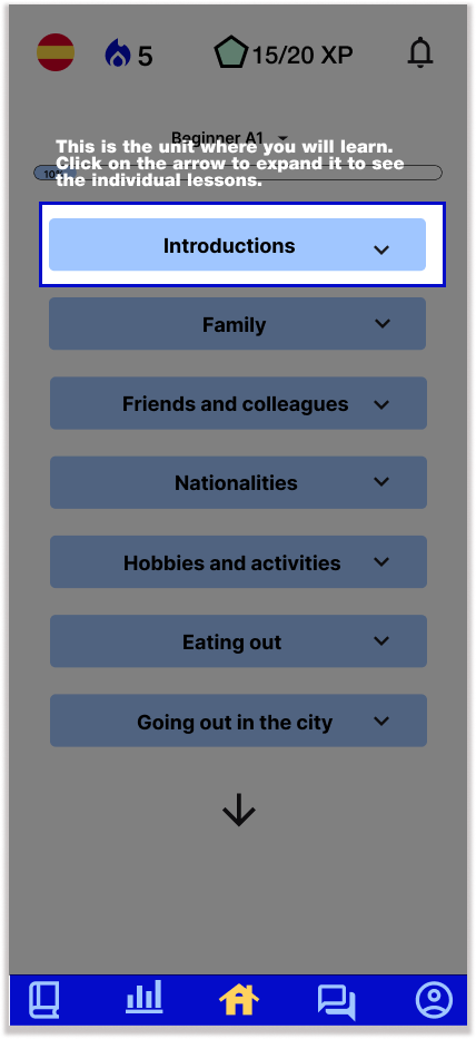 I wanted to have a hub for users once they’re in the app, which is what the image on the left is; it was inspired by similar apps. At the top are the usual icons: the language they’re learning, the daily learning streak indicator, the amount of experience per their daily goal, and the notifications. Once users click on the topic they want to study, they would go to the page (in the middle) where they could see a specific breakdown of the unit itself, with a progress bar to help guide them. Finally, the lessons themselves would look something to the frame on the right.
