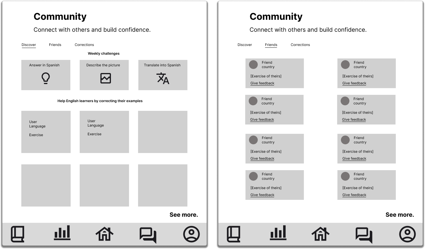 This is my idea for the Community section, where it would serve as a place to help give others feedback. On the left is where users could correct exercises of random people, as well as doing quick exercises of their own. Whereas on the right, this is where you would be able to focus specifically on what your friends have been doing.