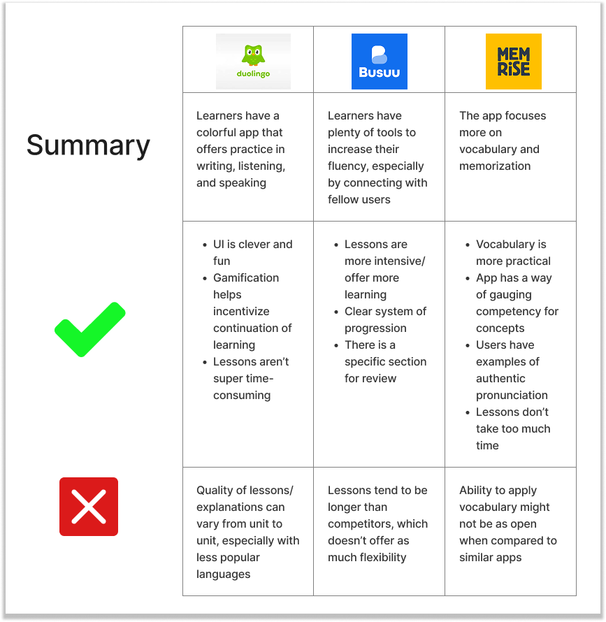 I needed to get an understanding for what already exists on the market, so I analyzed three of the most cited competitors: Duolingo, Busuu, and Memrise. By doing so, I was able to take the best aspects and use them for my own.