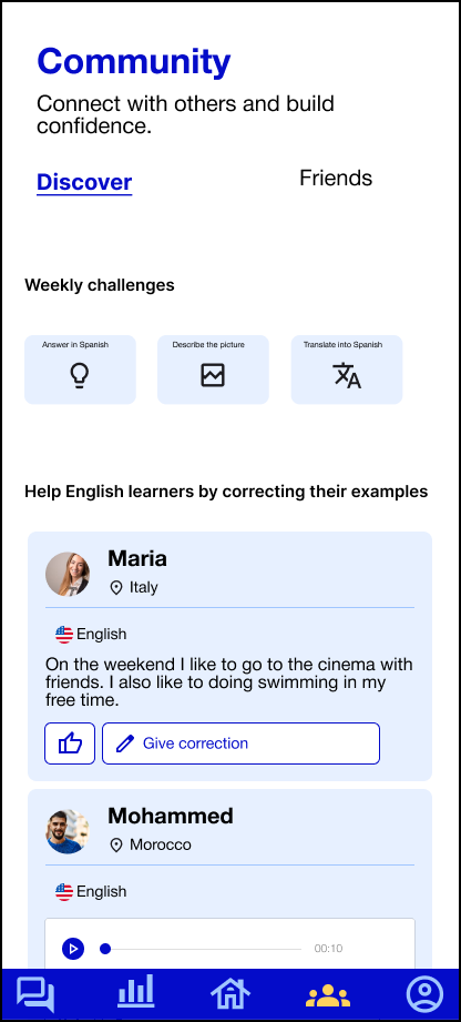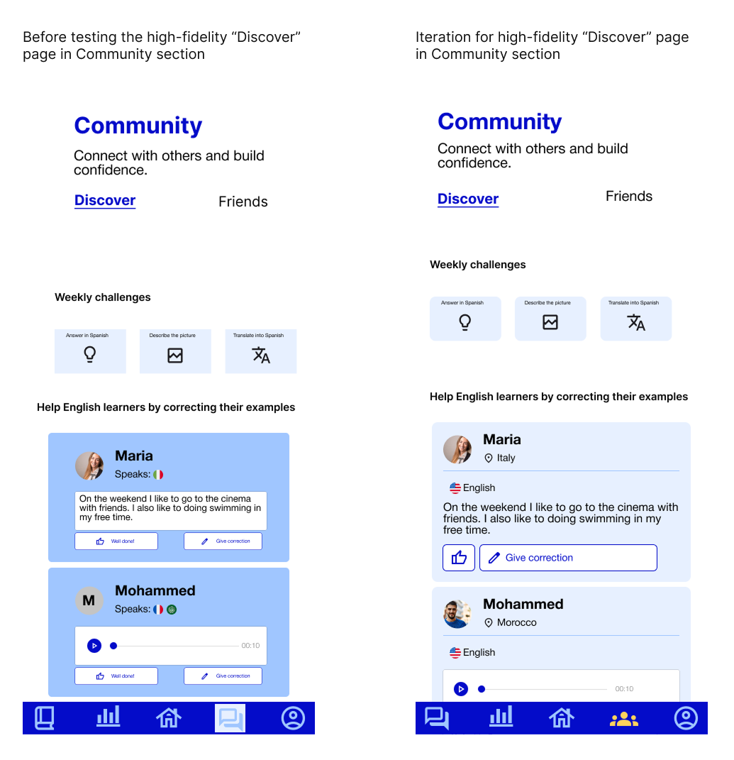 Similar to the “Discover” page in the Community section, I wanted to get an idea for how I could organize the exercises from users. Based upon the feedback, I had to clean up how the exercises were presented. The difference here is that users would be able to scroll down a finite amount to see all their friends who’re learning their native language.