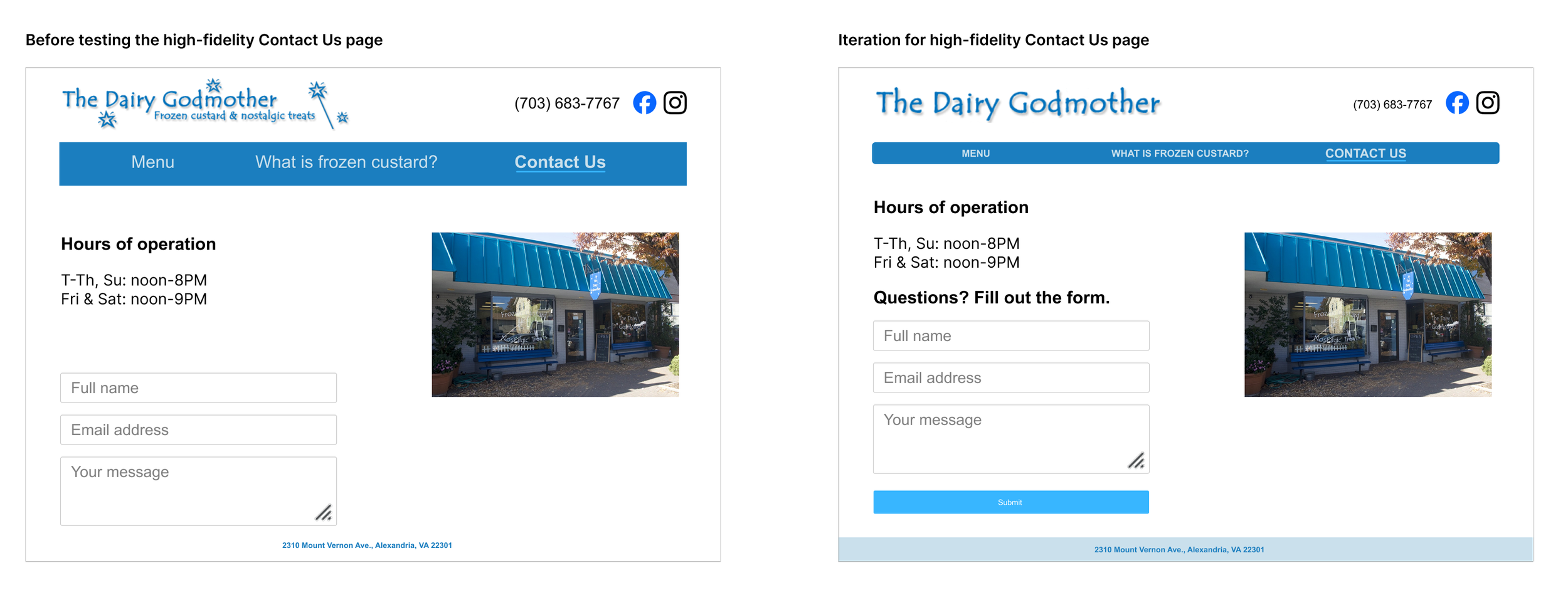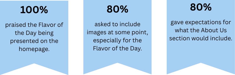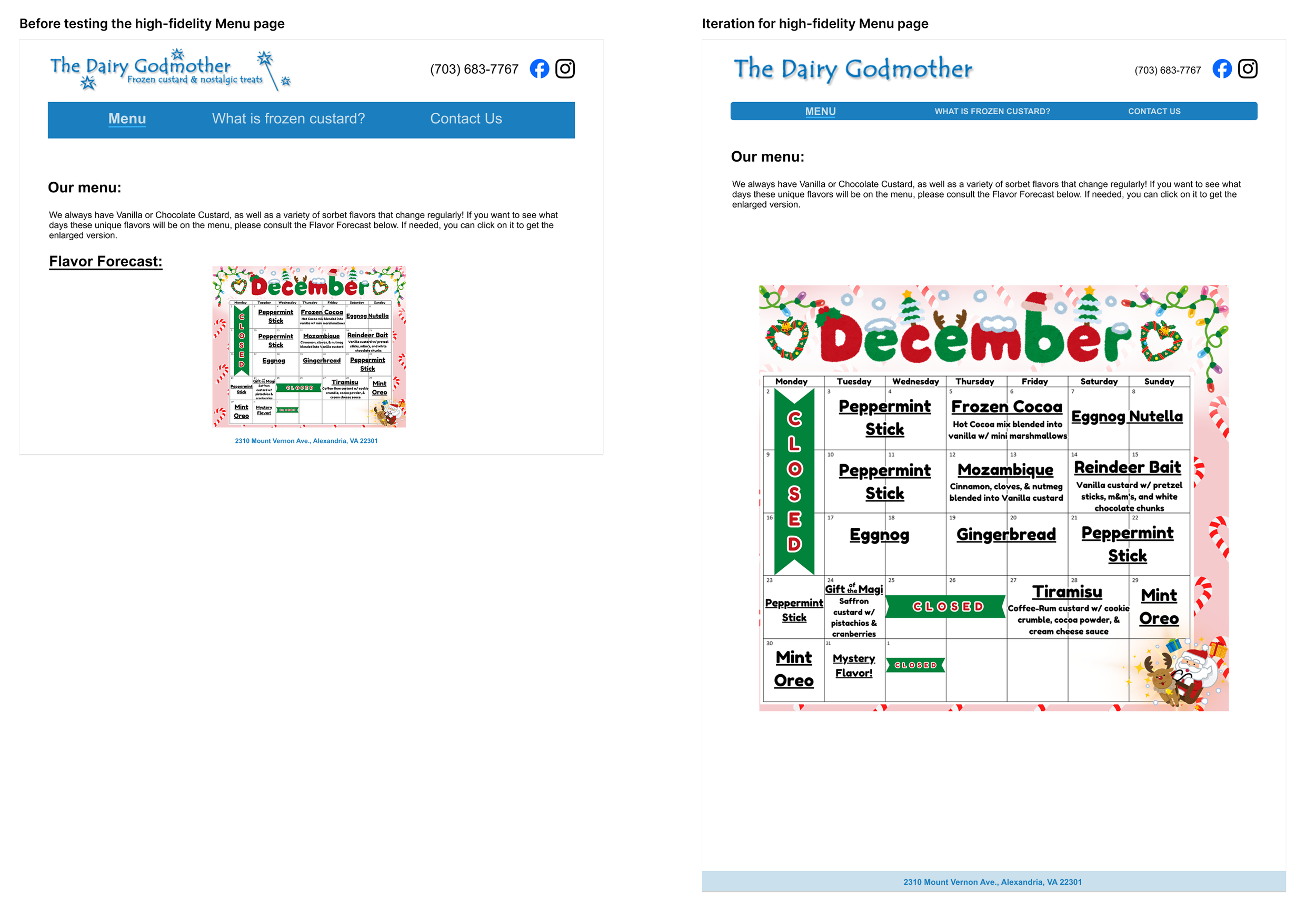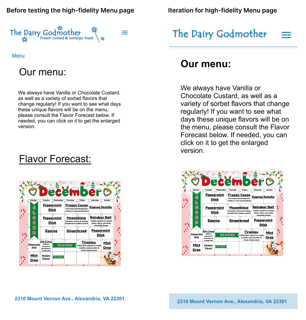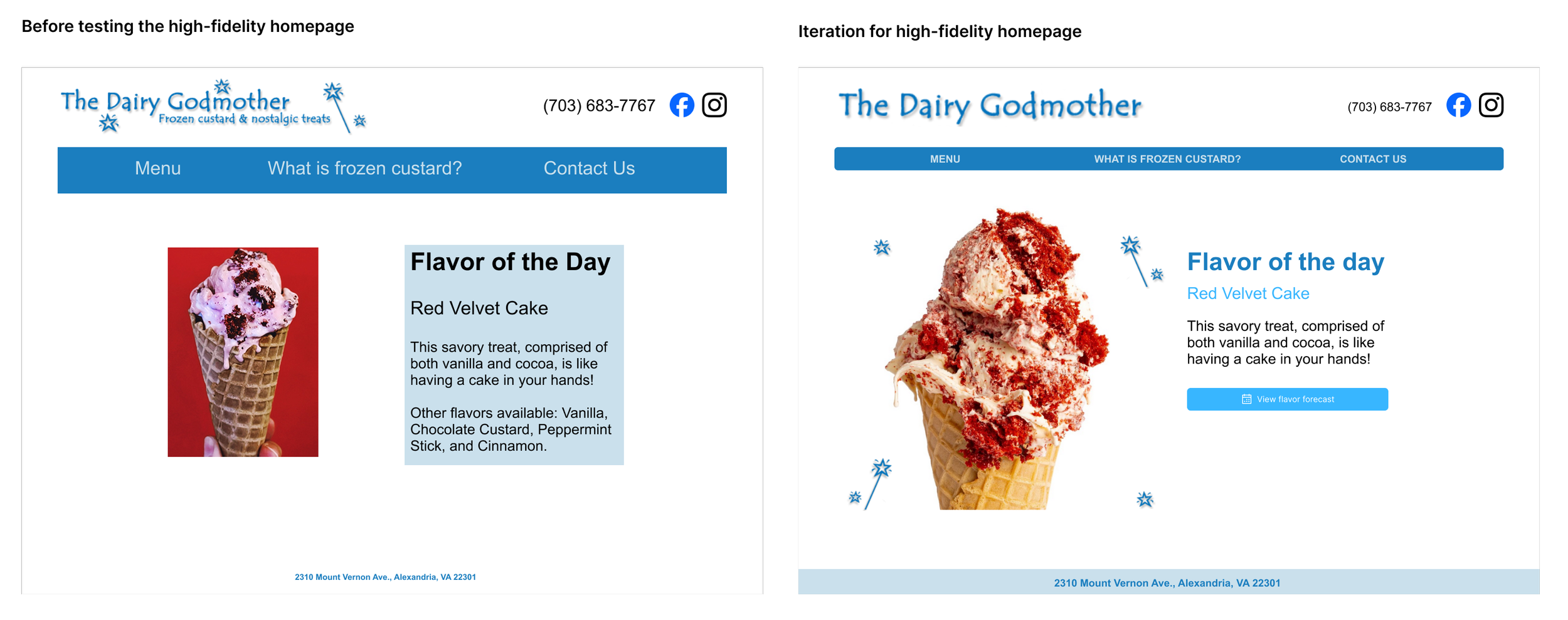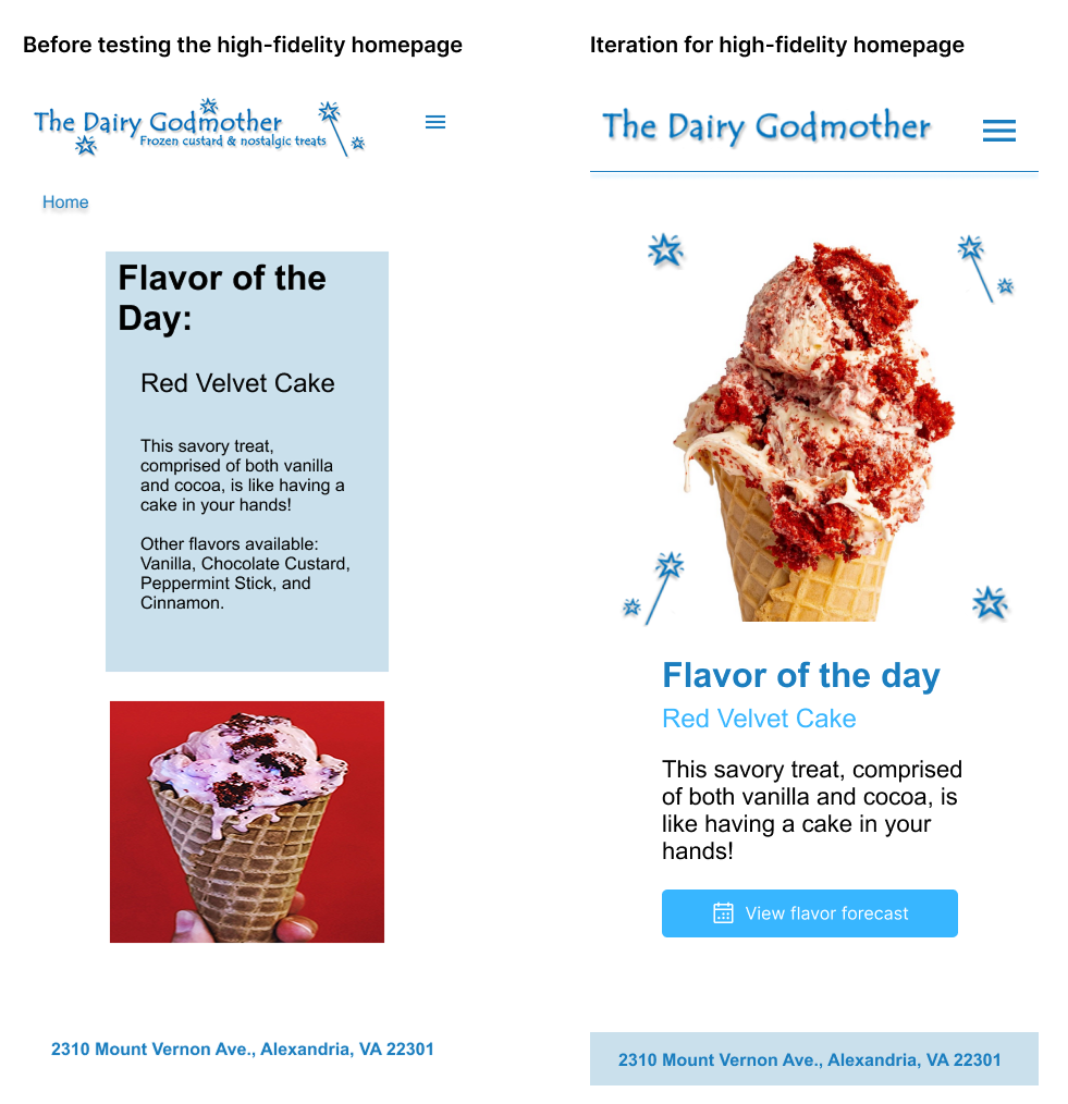 Going into this round of testing, I wasn’t quite sure how I wanted to incorporate the Flavor of the Day on the homepage; testing helped me conclusively settle on it. Three changes were made: 1) fixing the image/colors and adding a CTA button to be more vibrant, 2) adding a frame around the address (for both versions of the site), and 3) removing the page title at the top.