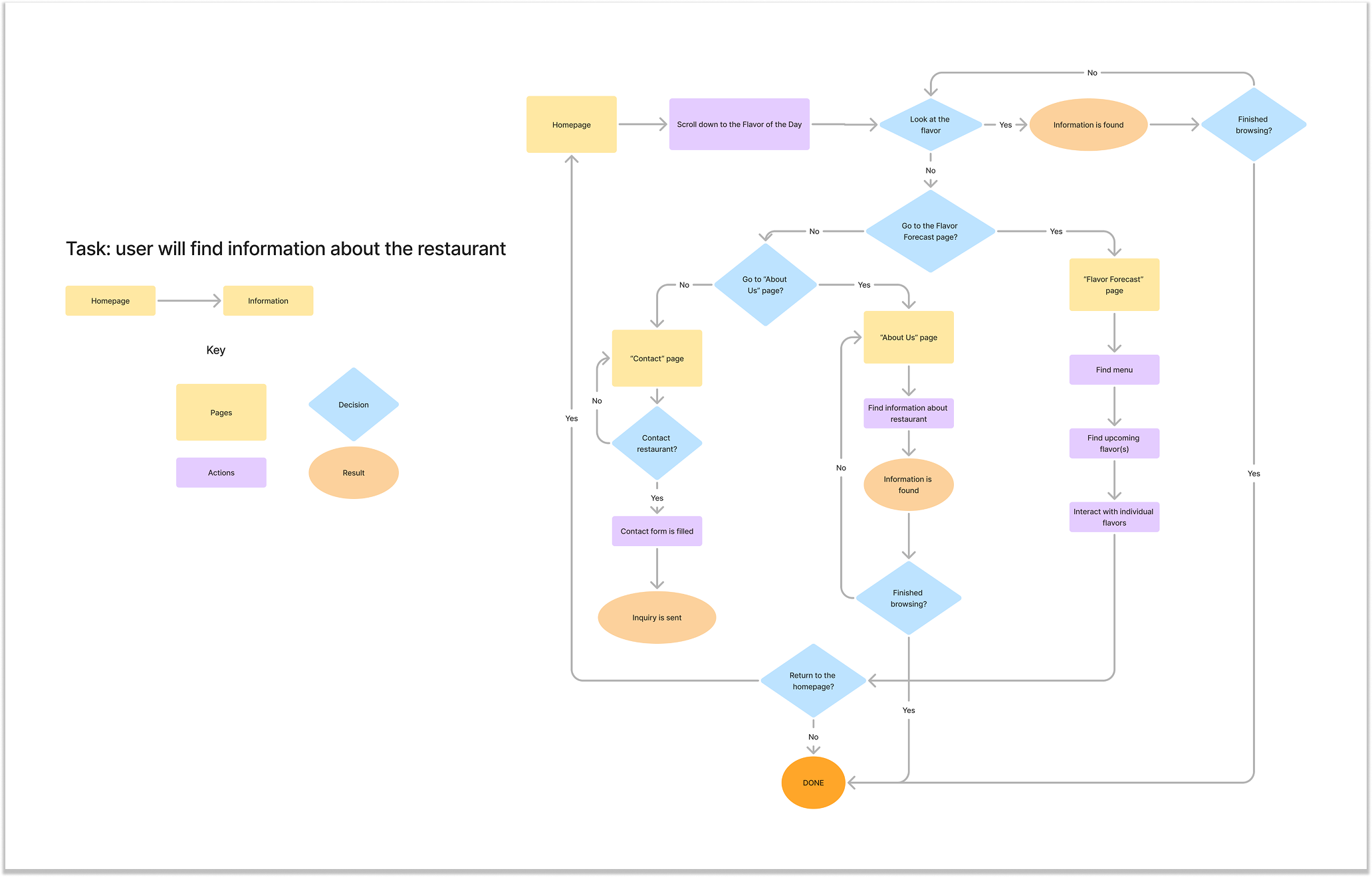 By doing this, users would show the ease of the site’s navigation and thus give me a better idea for what to improve. As seen below, the user flow attests to how I streamlined my version, for both desktop and mobile. Given the simplicity of the site, I opted not to create a task flow.