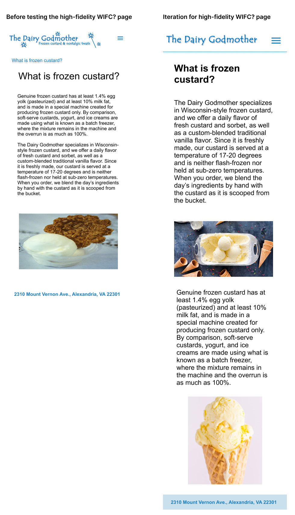Three of them mentioned how the text in “What Is Frozen Custard?” could be improved by changing the order it was presented in, to emphasize what The Dairy Godmother does